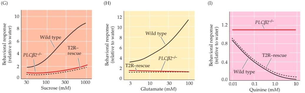 Molecular genetic experiments in mice indicate that some perceptual taste categories are established based on the identity of T1Rs and T2Rs that are expressed in individual taste cells. Initial support came from studies in which the genes that specify the sweet and amino acid heteromeric receptors (T1R2 and T1R1) were inactivated in mice. Such mice lack behavioral responses to a broad range of sweet or amino acid stimuli, depending on the gene that has been inactivated. Moreover, recordings of electrical activity in the relevant branches of cranial nerves VII, IX, or X showed that action potentials in response to sweet or amino acid stimuli were lost in parallel with the genetic mutation and behavioral change. Finally, these deficits in transduction and perception were unchanged at a broad range of concentrations, indicating that the molecular specificity of each receptor is quite rigid the remaining receptors could not respond, even at high concentrations of sweet or amino acid stimuli (Figure 15.25D-H).
